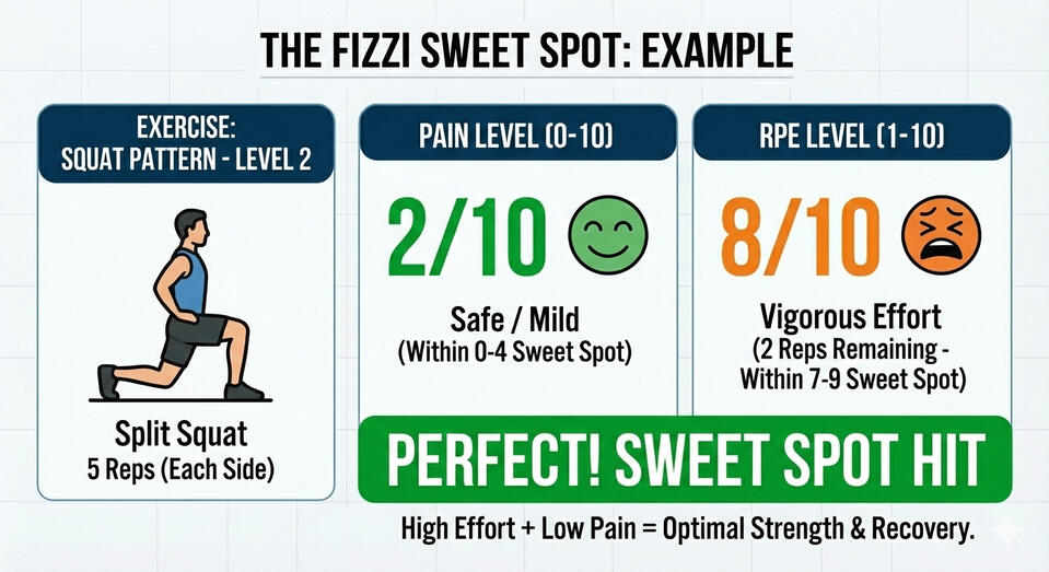Most rehab fails because it’s either too easy or too aggressive. We use the Fizzi Sweet Spot to find your exact "Safe Zone".